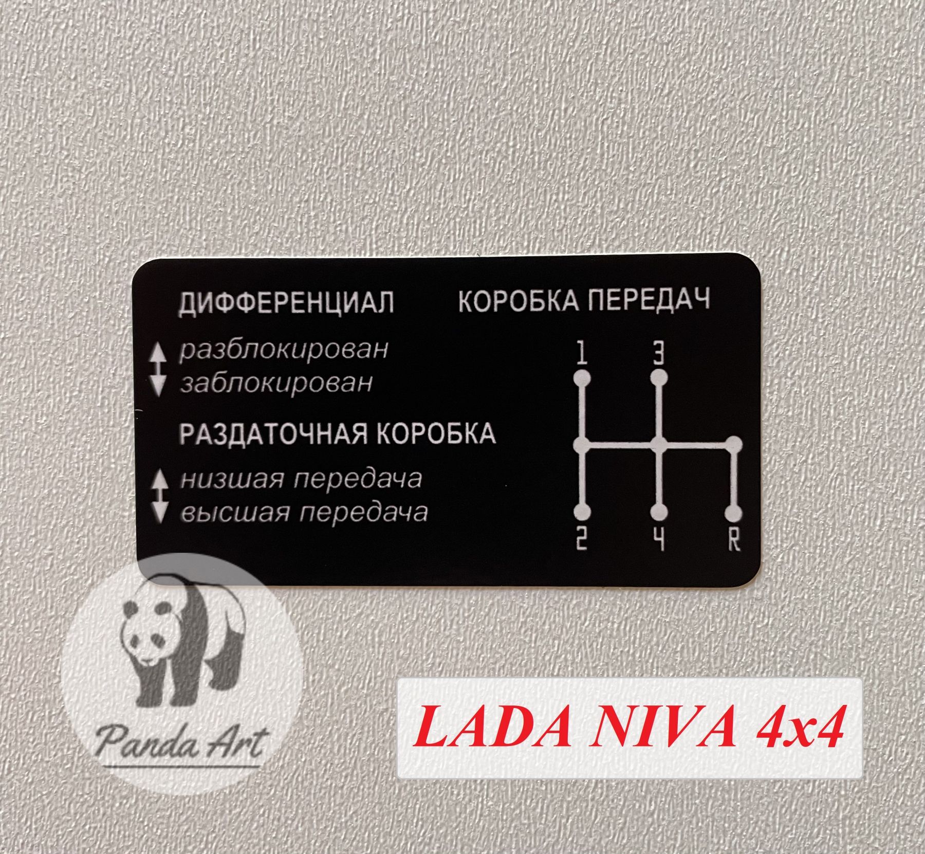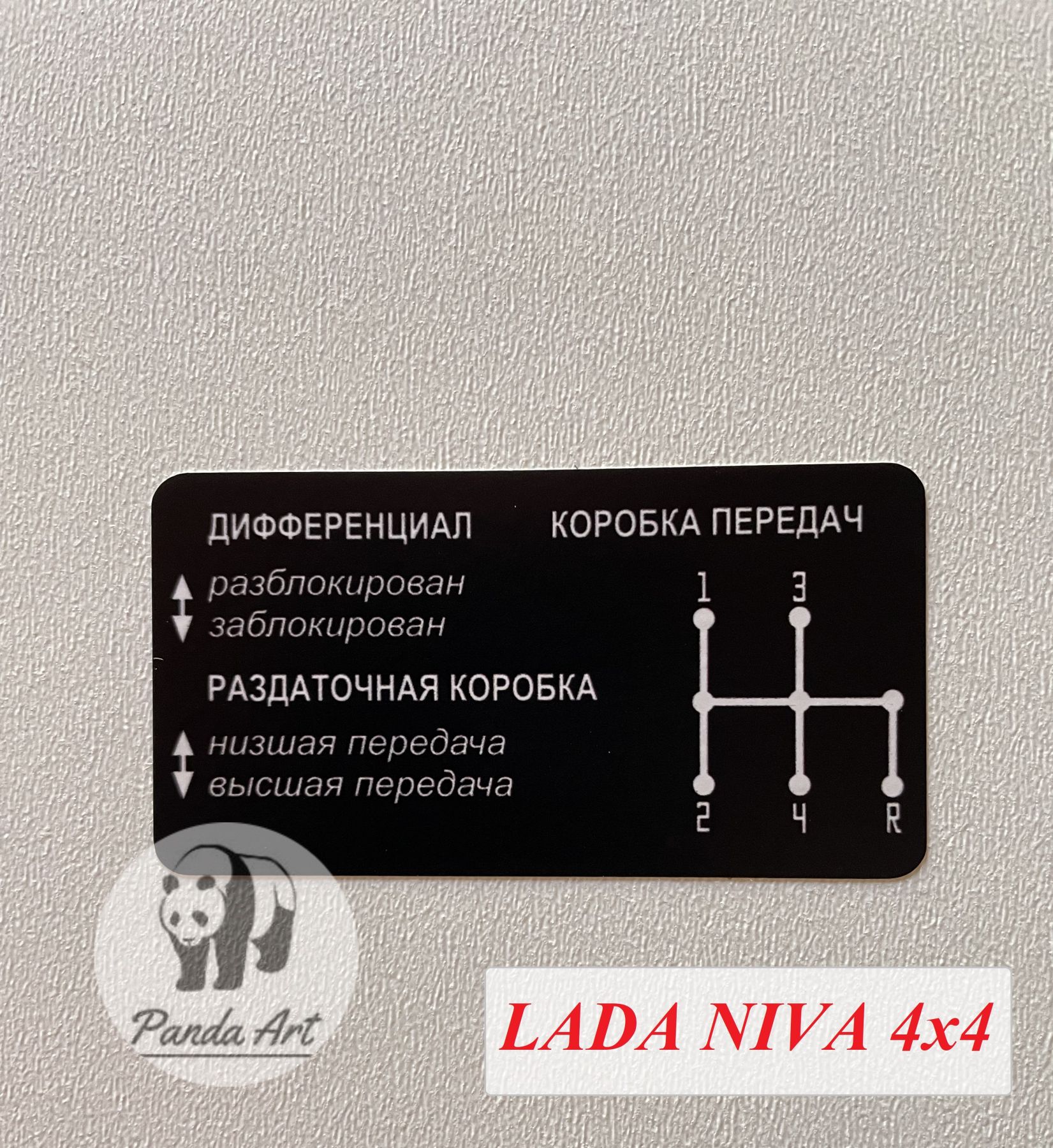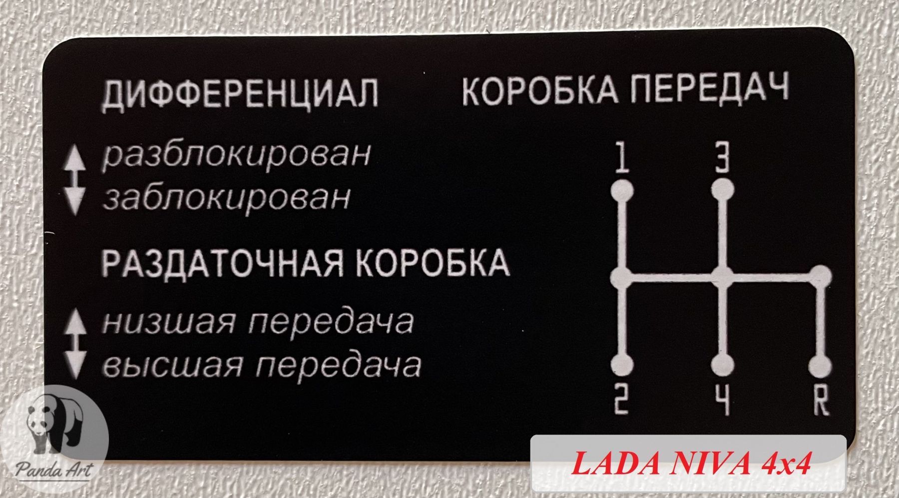 Информационная наклейка выбора режимов работы раздаточной коробки и коробки переключения передач для автомобилей семейства Нива (ВАЗ 2121, ВАЗ 2131). Для автомобилей с установленной КПП 4х ступенчатой.